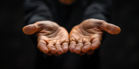 Close-up of open hands with fingers extended, palms up, in a gesture of offering or receiving. The background is blurred and dark. A symbol of hope and giving.