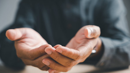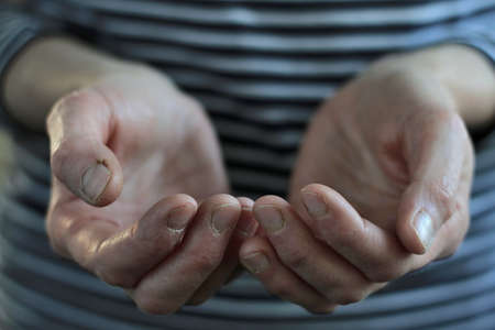 asking hands of a working man in the dark