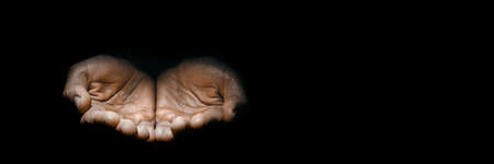 Black & white image of wrinkled male hands held out with palms up begging, isolated against a black background with dramatic lighting.
