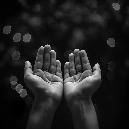 Black and white image of hands on a dark background with bokeh