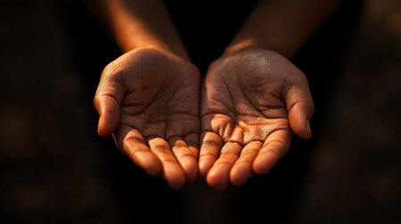 pair of open hands gently cupped together, illuminated by warm light, symbolizing giving, receiving, or offering in a moment of vulnerability or compassion.