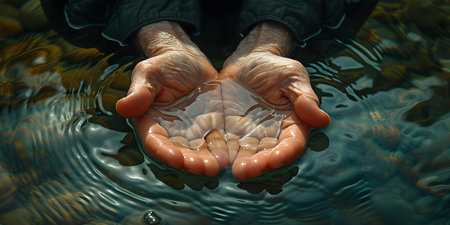 Sereneelderlyhandsplacidlyimmersedintransparentwatercloseupview. Concept Elderly Hands, Transparent Water, Close Up, Serene, Placid