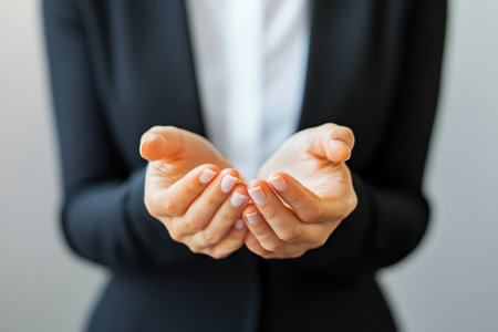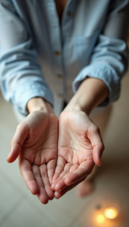 A pair of open hands, gently cupped and inviting, extend towards the viewer, symbolizing generosity and openness. The soft lighting and serene atmosphere evoke feelings of comfort and trust, making this image perfect for themes of support and connection.