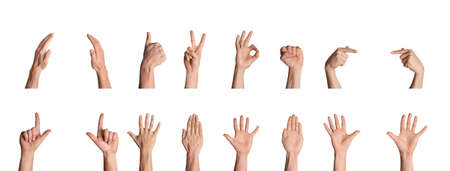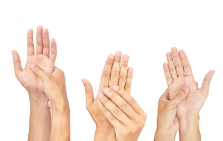 collection hand multiple of asian man in gesture isolated on white background