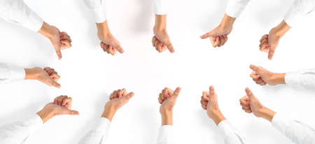 Line of group human hands showing thumbs up Top view. isolated with clipping path