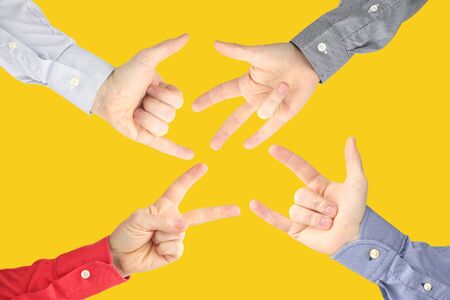 Mens hands on a dark background, show a game of stone, scissors, paper. The concept of confrontation and rivalry, games