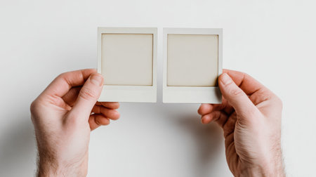 Two hands present blank instant film frames, inviting creativity and nostalgia, perfect for capturing new memories or artistic expressions.