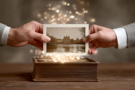 Warm tones highlight hands holding old photos, sparking nostalgia and a deep connection to cherished memories.