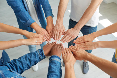 Young multiracial male and female friends putting their hands together in circle as symbol of unity. Hands of people in casual clothes stand in circle, showing friendship, cooperation and teamwork.