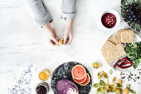 Woman in the kitchen and her healthy food eating selection: fruits, vegetables, super food, seeds, marble background copy space.