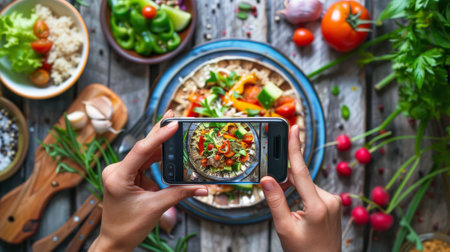 Food content creator blogger camera phone blog social media, producing and sharing content related to food channels online outlets vlogging culinary meal cooking