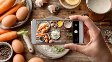 A person holds a smartphone to capture the beauty of fresh ingredients on a rustic wooden table, showcasing vibrant colors and natural light in a culinary setting.