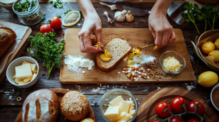 A person preparing a sandwich, spreading mustard on fresh bread with ingredients laid out