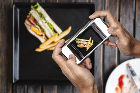 Taking food photo, food photography by smart phone, club sandwich with french fries on wooden table