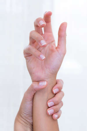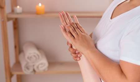 Woman suffering from hand pain or finger pain. Hand numbness or limb numbness. Massaging painful hand