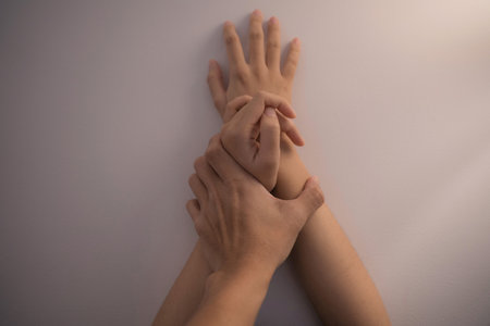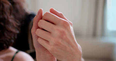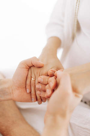 Close up horizontal image of female hands performing muscle testing at Theta healing session. Therapist and patient sitting and wearing white clothes. Energy healing concept