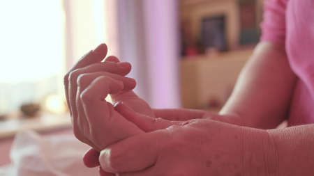Close up view of a hand massage session for anti aging done by a spa worker