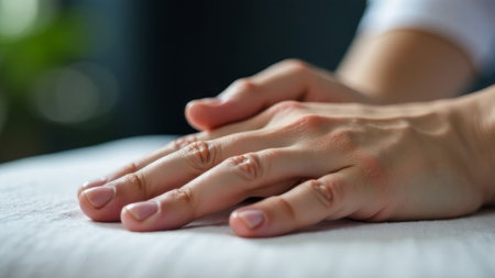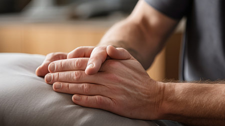 Massage therapist's hands on tense muscles neutral tones