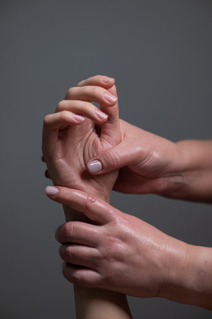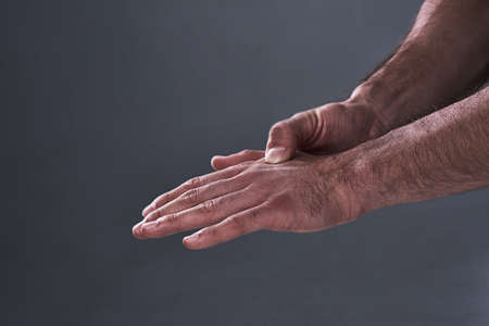 A man is massaging a hand. Close up. Toned.