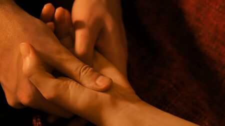 Professional male masseur doing hand massage for woman client at spa salon, studio. Warm romantic illumination, low key. Wellness, relaxation and healthcare concept