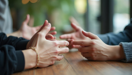 Two pairs of hands, one adorned with a bracelet, are animatedly gesturing over a wooden table, symbolizing a lively discussion. The image captures the essence of connection and communication, highlighting the intimacy of shared moments and the unspoken language of gestures.