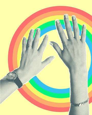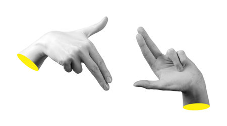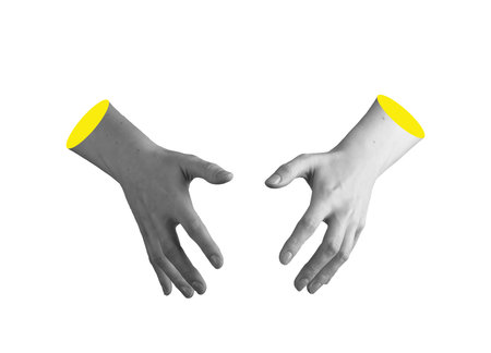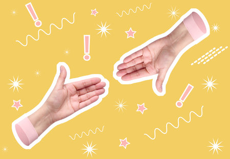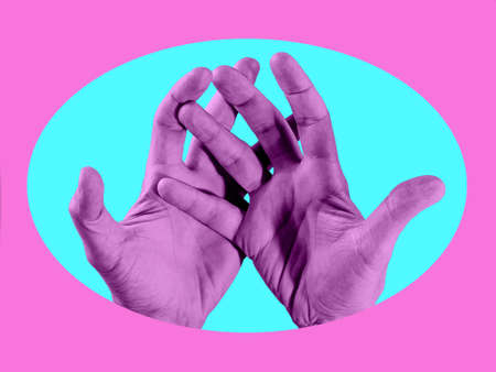 Two hand in a pop art collage style in neon bold colors. Modern psychedelic creative element with human palm for posters, banners, wallpaper. Copy space for text. Magazine style design. Zine culture.