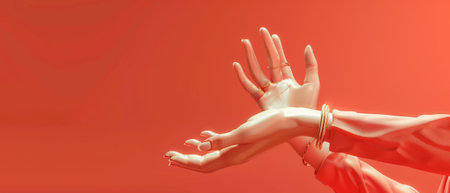 Render in 3D, white female hands isolated on coral red minimal fashion background. Jewelry shop display, elegant mannequin body parts in hand, showing, presenting.