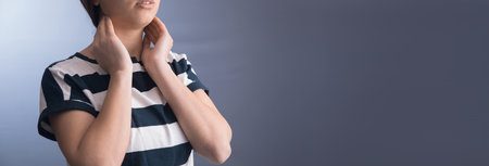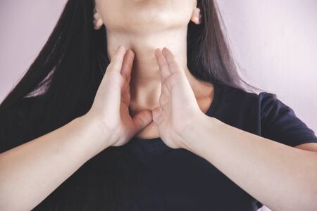 Asian woman touching her neck and throat for thyroid gland problem.