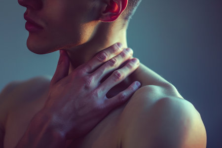 A close up of a womans hand holding her neck, AI
