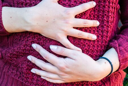 The close-up of a young woman's neck and hands on dark background