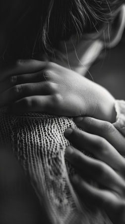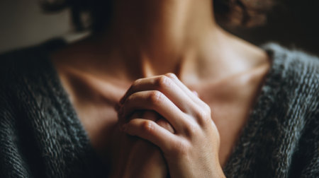 Close up image of person with clasped hands, conveying sense of contemplation and introspection. soft lighting highlights texture of sweater and delicate features of hands, creating serene