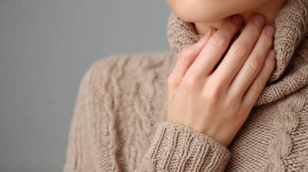 Cozy sweater with turtleneck design, featuring textured knit pattern. person gently touches their neck, conveying warmth and comfort. neutral color adds soothing touch to scene