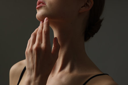 the woman gently touches her neck with her fingers