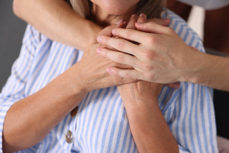 Son hugging his mother indoors, closeup. Family bonding