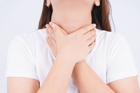 Female touching acute throat pain on white background with copy space. Medical, healthcare for advertising concept.