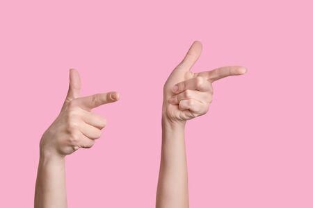 Two Caucasian hands indicate the direction to the right. Pink isolated background.