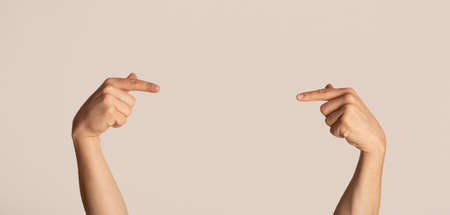 Two Woman's hand are pointing or indicating to copy space area for communication and advertisement and promotion and text on white background