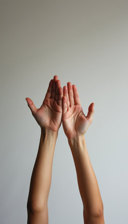 Two hands, one light and one slightly darker, are raised high against a minimalist gray background, symbolizing aspiration and hope. This image captures the essence of reaching for dreams and the beauty of human connection through diverse skin tones.