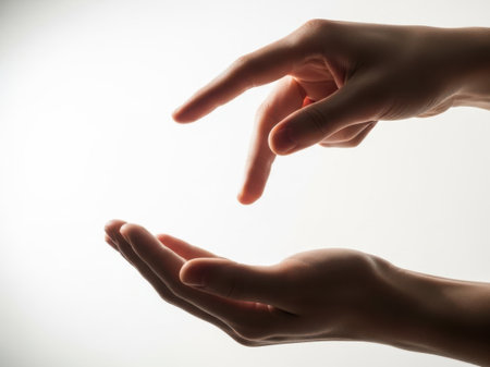 This image features two hands reaching out towards each other against a white background. The hands are positioned centrally, with one hand extending upwards and the other downwards, creating a sense of connection and interaction. The white background enhances the focus on the hands, making them the central element of the image.
