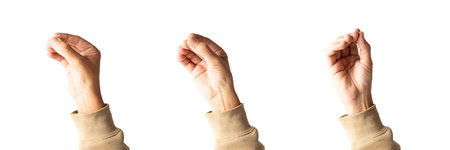 Male hand with beige pullover or sweatshirt doing holding gesture isolated on white background