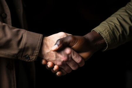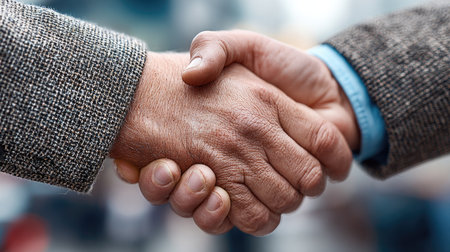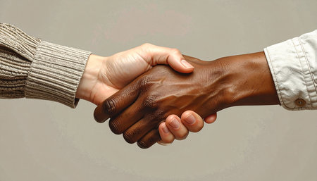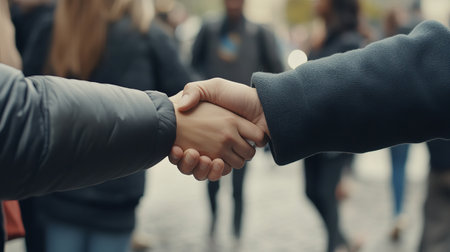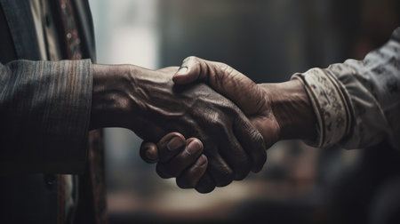 A close-up of two hands engaged in a handshake, symbolizing agreement, unity, and collaboration across diverse backgrounds.