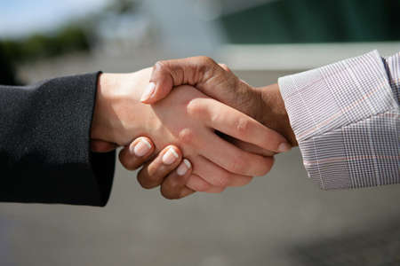 Close-up view of two individuals engaging in a formal handshake gesture. Both people are dressed professionally, and their hands are firmly clasped together in agreement.