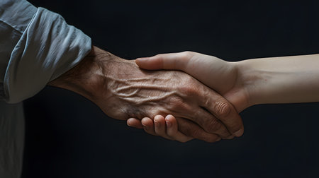 Two elderly individuals share a warm handshake, their hands showing signs of age with wrinkles and tenderness. The scene captures a moment of connection and compassion between them.