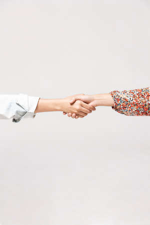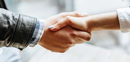 Strong agreement. A close up of handshake with gratitude. A man and woman shaking hands in acknowledgement of partnership.