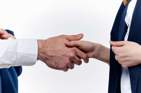 Hands of a man and a woman are connected by a handshake. Metaphor of rescue, love, assistance.
