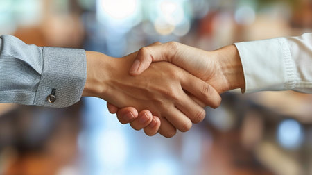 Close-up of two professionals shaking hands, indicating a successful agreement. Blurred background, suggesting a professional setting. Concept of collaboration and partnership.