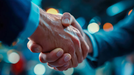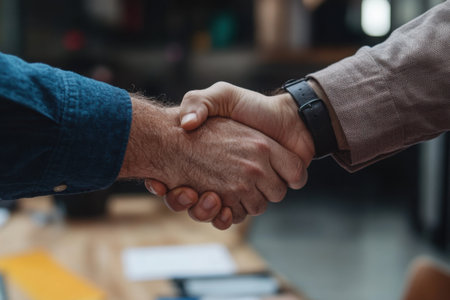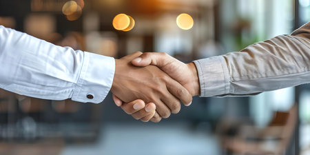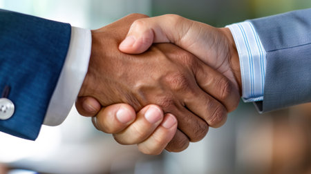 A close-up view of two hands shaking, representing a business agreement. The image symbolizes trust, partnership, and collaboration in a professional setting, highlighting the importance of successful negotiations and teamwork.