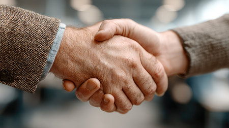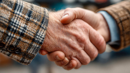 Close-up of two hands shaking, one in a plaid jacket, symbolizing agreement, trust, and mutual respect in a warm business setting.