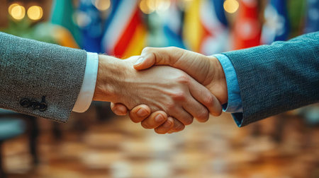 Two businessmen shaking hands outdoors, with international flags in the background. Symbol of diplomacy, agreement, and cooperation between nations.