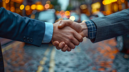 A close-up of two hands engaged in a confident handshake, set against a stunning city skyline, symbolizing trust and partnership in a business environment.